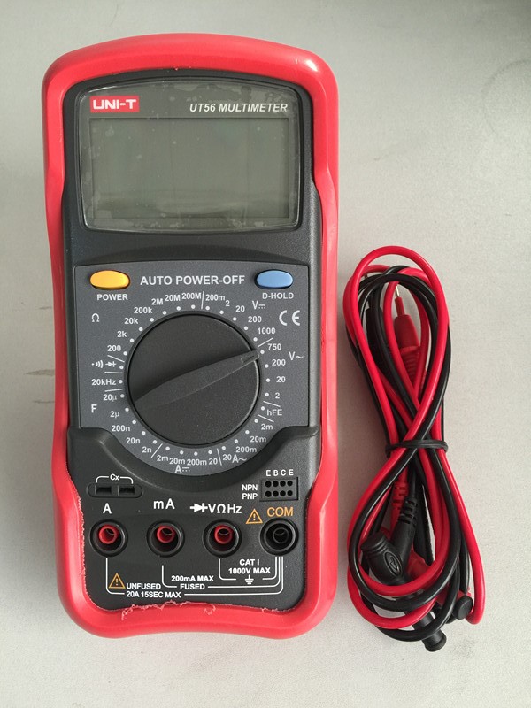 全新“UT50”系列中的UT56是一种性能稳定、高可靠性手持式4 1/2 数位数字多用表,整机电路设计以大规模集成电路,双积分A/D转换器为核心并配以全功能过载保护,可用来测量直流和交流电压、电流、电阻、电容、二极管、温度、频率以及电流通断,是用户理想的测试工具。